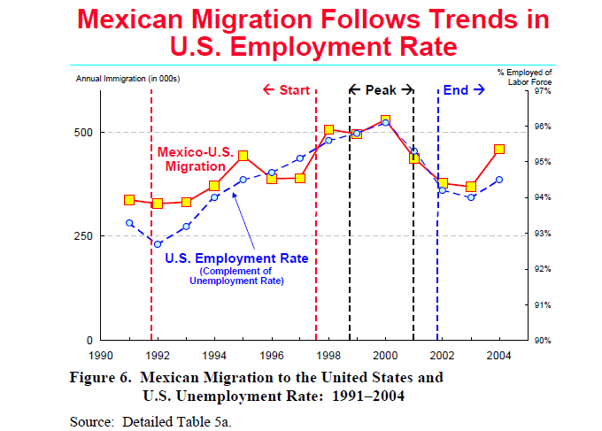 The graph is interesting for a variety of reasons, but let’s stick to the most obvious for this brief post: it shows that the great magnet to the US is, not surprisingly, jobs. When there is greater demand for labor in the US economy, more labor flows in. This is basic, basic economics.