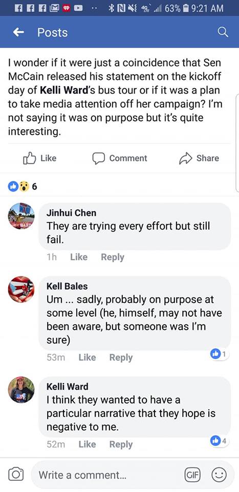 One of Ward’s staffers on Saturday wrote a Facebook post wondering whether the timing of the statement from McCain’s family, made on the same day that Ward’s statewide bus tour kicked off, was simply a coincidence or a tactic “to take media attention off her campaign.”
