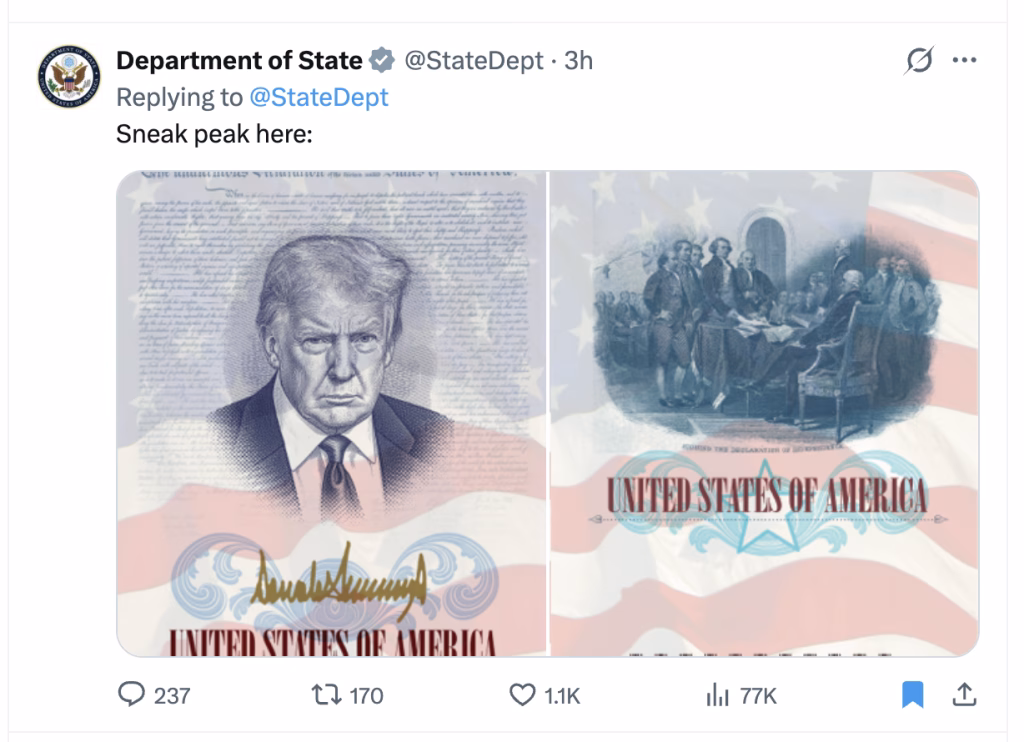 Politico reports: State Department to release limited edition ‘America250’ passports with Trump’s face.
