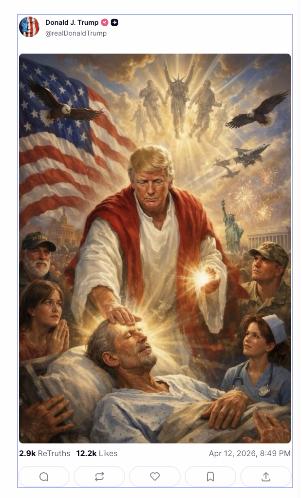 I’m very impressed by Mr. Trump’s image as a widely beloved healer. It would be more impressive if we tortured him to death and waited for him to rise after three days. I have plenty of nails; do any of you have extra wood?