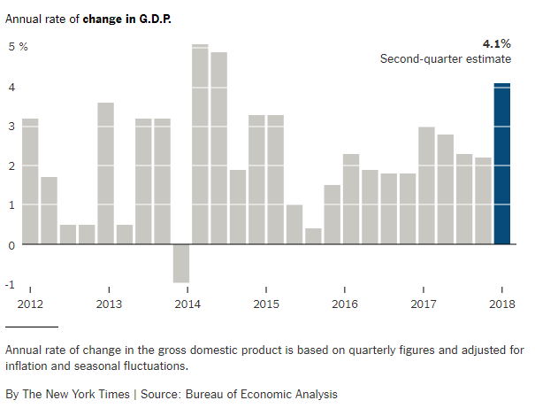 The Commerce Department estimated that growth in the second quarter of 2018 rose to 4.1 percent, the fastest quarterly rate since 2014. Economists have questioned whether growth can continue at such a pace, but Mr. Trump and his advisers argued it was more than a “one-time shot,” citing, among other factors, gains in business investment and productivity that they said resulted from deep cuts in corporate taxes.