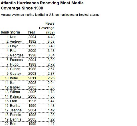I don’t know. What’s easier to evaluate is how much coverage Hurricane Irene received in comparison with other hurricanes. By that standard, the coverage was quite proportionate to the amount of death and destruction that the storm caused.