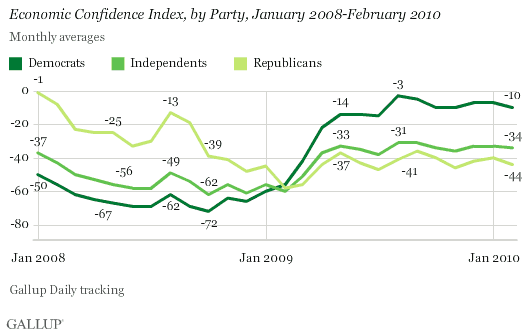 I do think that the binary nature of US parties helps steer people’s analysis of whether, for example, the economy is getting better or worse, as in your example. One party is pretty forthrightly against minimum wages increases, is anti-union, and pro-business in a general sense. The other party is, not too surprisingly, for minimum wage increases, nominally pro-union and less friendly towards business interests generally. When, as in 2008, the economy is cratering, with 500,000 jobs lost per month (give or take), and the election results in a change in the party of the executive, it seems unclear to me that responding to a survey that you think the economy is “getting better or worse” if you are a “D” and work for minimum wage or near that level, or if you are a union member, that you might think that the change at the Presidential level may be a sign of good things to come. Is that purely partisanship? I think that you would say it is, as there was obviously no tangible change in the economy (yet) at the time of the survey you noted. But, I don’t think that it is purely an irrational, emotional reaction either. If you are the position of someone for whom an increase in the minimum wage would have a positive impact for you personally, the election of a Democrat seems to me to be “moving in the right direction”. Of course the reverse is true for Republicants.