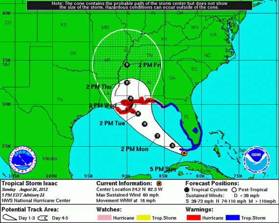 I want to be fair here. I’m neither a meteorologist nor a New Orleans official, planner or expert. Perhaps Landrieu is right, and I’m wrong. Perhaps New Orleans now has plans that will allow it to effectively evacuate in 24 hours’ time. My understanding has been that that’s basically impossible, but again, I’m concededly not an expert. It’s certainly true that, by midday tomorrow, we’ll have more and better information about Isaac’s projected path and intensity at landfall, both of which remain maddeningly difficult to pin down right now. So if it’s reasonably possible to wait until tomorrow morning to make the call, that would certainly be preferable. I’m just not so sure it’s reasonably possible. I thought the decision needed to be made today, despite the admittedly imperfect information and the very significant chance of a false alarm.