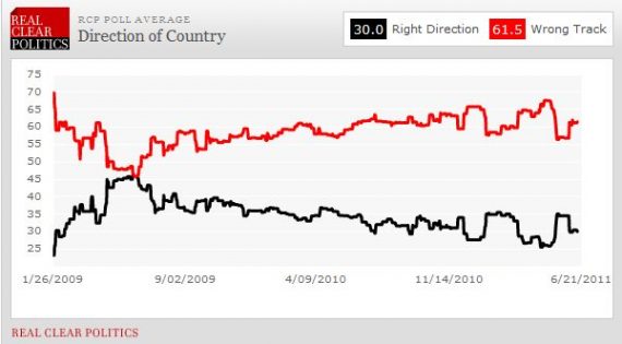 This isn’t as bad as the area immediately before the 2008 election, when as many as 83% of Americans said the country was on the wrong track, but the trend of late has been an increasing amount of pessimism, and that’s generally bad news for incumbents.