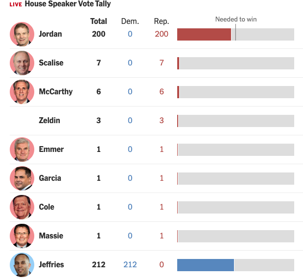 UPDATE (1346): There are enough (20 at this moment) Republican votes for other-than-Jordan that he won’t make it on the first ballot. Time will tell whether those folks cave in subsequent rounds or Jordan’s bid is ultimately defeated.