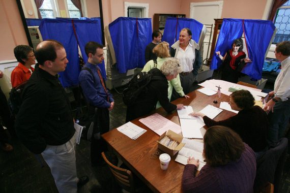 People wait in lines to vote in the Pennsylvania Primary at Trinity Memorial Episcopal Church in Philadelphia, Tuesday, April 22, 2008. (AP Photo/Matt Rourke)