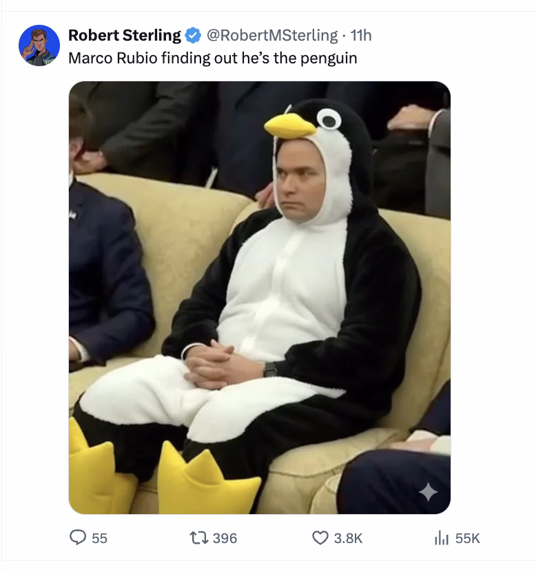 Accuracy of factoid is unknown (even if the actions are accurate, it would require knowing the inner thoughts of a penguin), and it’s probably not what the Trump-penguin thing is trying to say.