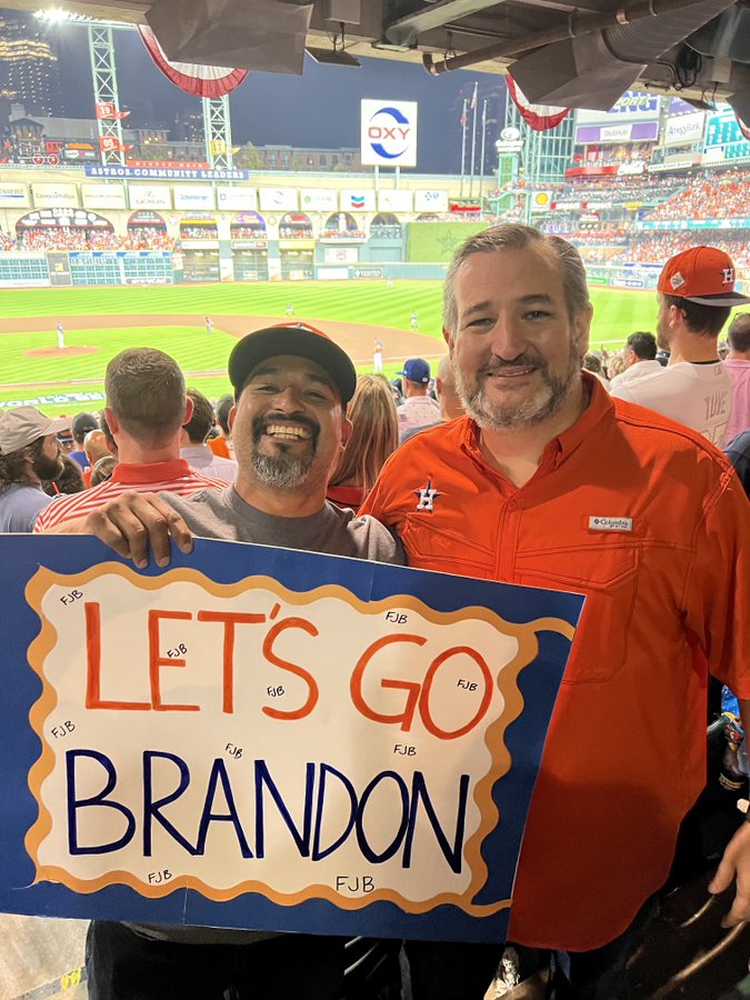 Texas Sen. Ted Cruz, no stranger to memes, has also added to this discourse when he posted a photo from Game 2 of the World Series with another Houston Astros fan whose sign reads “LET’S GO BRANDON” in big bold letters.