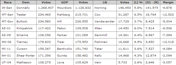 David Nir at Daily Kos found nine Congressional or Senate races where the amount of votes received by the Libertarian Party candidate exceeded the difference between the winning Democratic candidate and the Republican candidate: