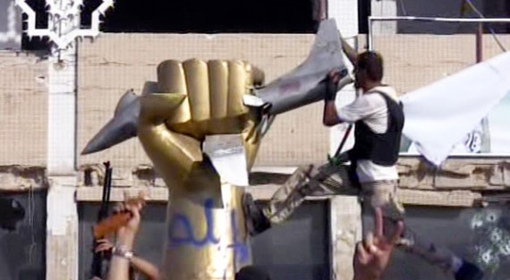 In what could become a defining image, the footage showed fighters scrambling to topple one of Colonel Qaddafi’s favorite sculptures: a giant fist crushing an American jet fighter. Colonel Qaddafi had installed the sculpture in front of a house on the compound that was bombed on orders of President Reagan in 1986, when Libya was considered a pariah state. The wrecked building became Colonel Qaddafi’s backdrop for major speeches, including his defiant challenge to the rebels at the start of their uprising six months ago.