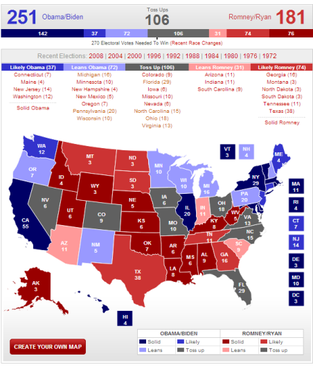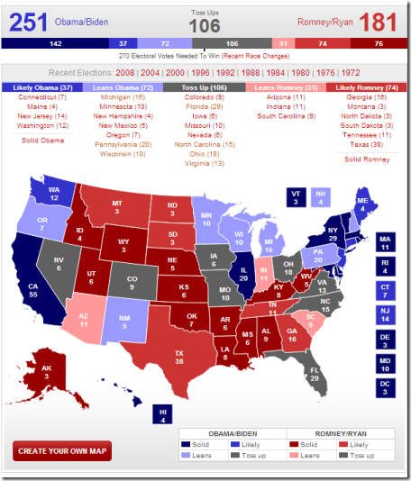 Consider that if this is accurate, Obama needs to find only 19 of the 106 toss-up electoral votes (i.e., 17.8% of the take) while Romney needs 89 (84.0%). This means if, starting with the base of 251, Obama only needs one of the following combinations (and I am not giving all of them): Florida alone, Ohio+any other state, Virginia+Iowa, Virginia+NV, VA+CO, or several others. Romney, on the other hand, has to almost sweep the swing states. Is this possible? Sure, but the probabilities don’t look all that great at the moment.