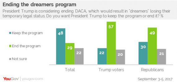 President Trump’s decision on Tuesday to rescind the Deferred Action for Childhood Arrivals kept a promise he made during the campaign – a promise that matters to those who voted for him last November. The DACA program – which protects undocumented individuals brought to the United States as children and grants temporary legal status to those “dreamers” – is supported by most Americans, according to the latest Economist/YouGov poll. But Trump voters overwhelmingly oppose it, while Republicans are closely divided.