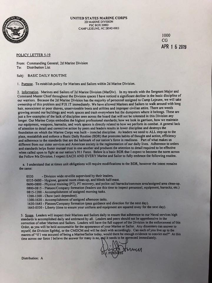 Major General Dave Furness bemoaned the “significant decline in the basic discipline” of Marines and sailors of the Division, evidenced by their “long hair, nonexistent or poor shaves, unserviceable boots and utilities and improper civilian attire” as well as “weeds growing around [2nd MarDiv] buildings and work spaces and trash everywhere but the dumpsters where it belongs.” He sees these anecdotal observations as evidence of a general cataclysmic breakdown in discipline and purports to remedy it by prescribing a standard “Basic Daily Routine” for all 2nd MarDiv units, prescribing actions to be taken all the way down to the platoon and company formation — 3-4 levels of command beneath his own. He challenges “dissenters” to “answer to [the Division Commander], the Division SgtMaj, or the [Command Master Chief, a Navy senior enlisted member who is the SgtMaj’s Navy counterpart for Corpsmen and other assigned enlisted Navy personnel].