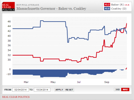 This poll from the Boston Globe shows a bigger gap between Baker and Coakley than other recent polling, but it appears to be indicative of a shift toward Baker in the closing weeks of the campaign rather than just an anomaly. Coakley has not led in a poll since early October, for example, and Baker currently has a +4.5 point lead in the RealClearPolitics average, an average that has clearly shown Baker rising and Coakley falling with very little time left: