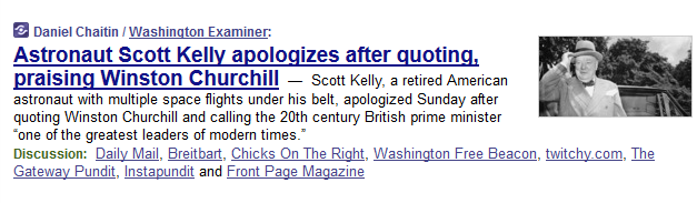 The Scott Kelly story, which is an insignificant “something silly happened on Twitter” controversy, is in various right-leaning news outlets in both the US and UK and linked by a handful of blogs. All of them from the right.
