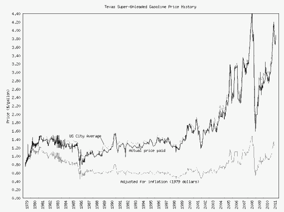 What caused the 2008 collapse, then, a collapse so dramatic that it’s echoed when you adjust the price figures for inflation? Obviously, it was the 2008 worldwide financial collapse and recession, with its subsequent decreases in demand, that led gas prices to reach levels we haven’t seen in nearly ten years now. Once the crisis was over and the world economy started to recover, prices started going back up again as demand returned to normal, pre-crisis, levels.