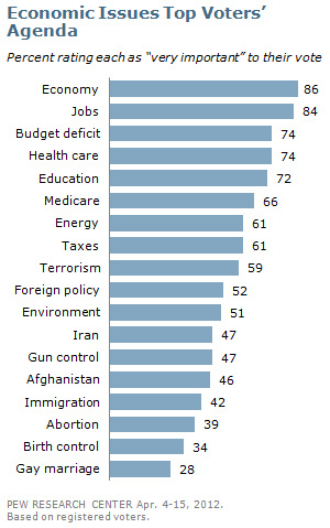 More than eight-in-ten voters say the economy (86%) and jobs (84%) are very important issues in deciding who to vote for this fall. Roughly three-quarters also cite the federal budget deficit (74%), health care (74%) and education (72%) as top voting priorities. Near the bottom of the list are some of the hot-button social issues. Just 28% say that gay marriage is a very important issue, and 34% rate birth control as a top issue.