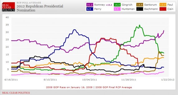 Lest you think the Fox poll is an anomaly, take note that the latest Gallup Daily Tracking Poll numbers have Romney at 37%, with Santorum at 14 percent, Gingrich at 13 percent, Paul at 12 percent, Perry at 5 percent and Huntsman at 3 percent. And, most significantly, all the national polls taken since last week — including CNN and Reuters/Ipsos — show Romney at or above 30% with no candidate within 10 percentage points of him.