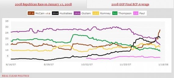Nice comparison to the 2008 race; I’ve been wondering why people think Romney has some particular or unusual weakness when this race doesn’t seem that unusual to me, except for the boom/bust cycle of his opponents, which probably says more about them than Romney.