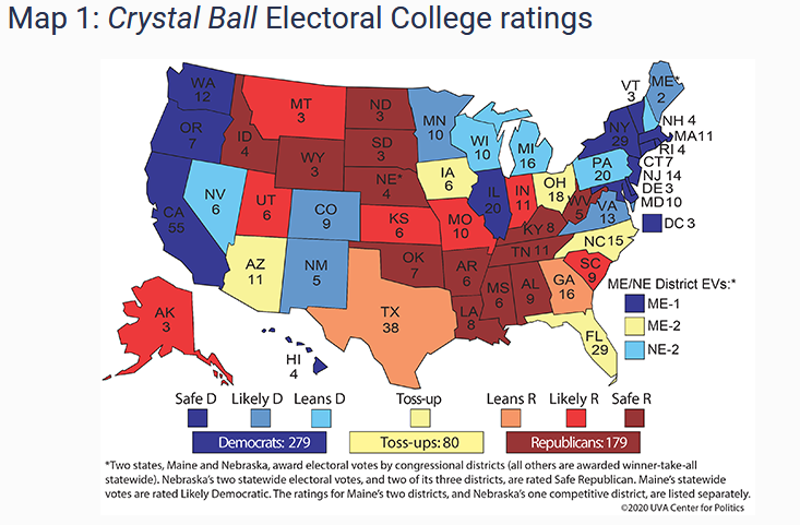 Likewise, and perhaps more dramatically, Larry Sabato’s Crystal Ball now has Biden with 279 electoral votes when combining Safe D, Likely D, and Leans D states: