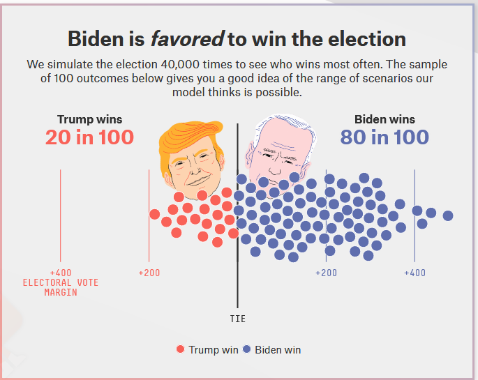 For example, 538’s forecast has moved Biden’s odds to 80% for the first time since the model launched:
