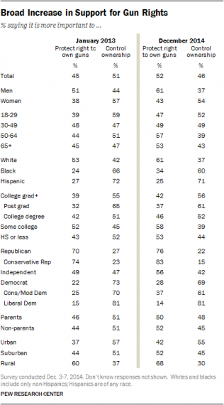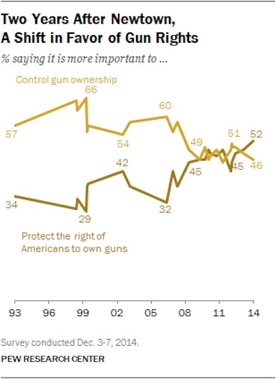 In a 2000 Pew survey, 29 percent chose gun rights over gun control, and in a 2013 survey conducted a month after the Newtown shooting, 45 percent favored gun rights.