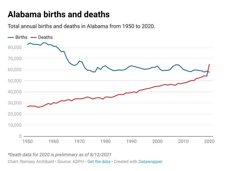 “This is the first year in the history of Alabama that we’ve had more deaths in our state than we had births in our state,” Harris said. “Our state shrank last year. And it’s not a coincidence that that’s about exactly the number of deaths we had from COVID.”
