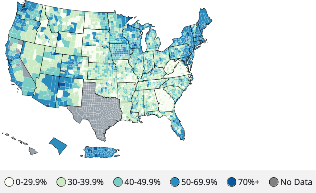 Here’s a CDC map of vaccination rates by county (percentage of those fully vaccinated):