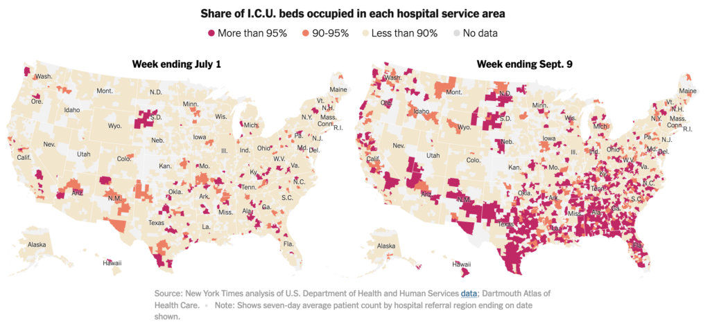 The NYT has some instructive data visualizations of the current surge in the need for ICU beds in the southeastern United States. For example: