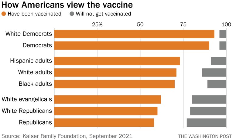 Since late last year, there’s been a wide gulf between the willingness of Republicans and Democrats to be vaccinated against the coronavirus. That continues. In September, Kaiser Family Foundation polling found that Republicans were much more likely than Democrats to say that they intended to never receive a dose of a vaccine.