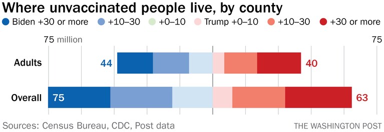 Combining the most recent vaccination percentages from the Centers for Disease Control and Prevention with county-level population data from the Census Bureau, we see that there are about 4 million more adults in blue counties who are unvaccinated than in red counties. When expanding that to the entire population, the spread is 12 million people. (The distinction between all residents and all adults is important because of who is eligible for the vaccine.)