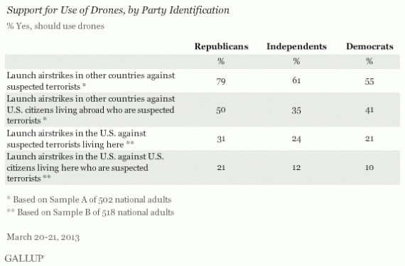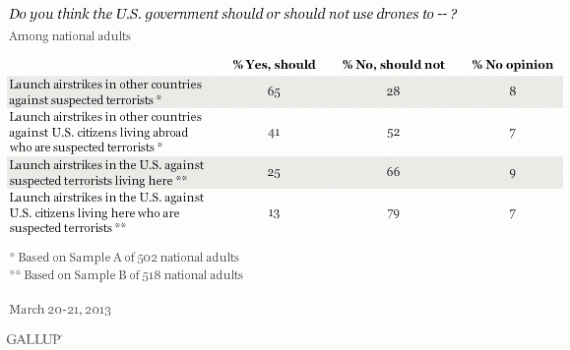 A new Gallup poll (“In U.S., 65% Support Drone Attacks on Terrorists Abroad“) released today shows overwhelming support for the drone program. Alyssa Brown and Frank Newport report,