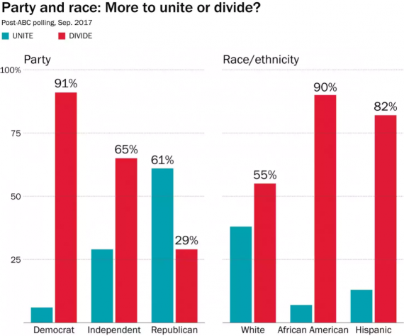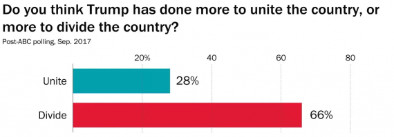 Washington Post-ABC polling released Sunday suggests that, even before Trump inserted himself into the NFL protests, most Americans viewed him as a president who was doing more to divide the country than to unite it. About two-thirds of Americans felt that Trump, despite his insistent rhetoric that the country needs to unite, was, in fact, driving Americans apart. About 3 in 10 said Trump had helped unite the country.