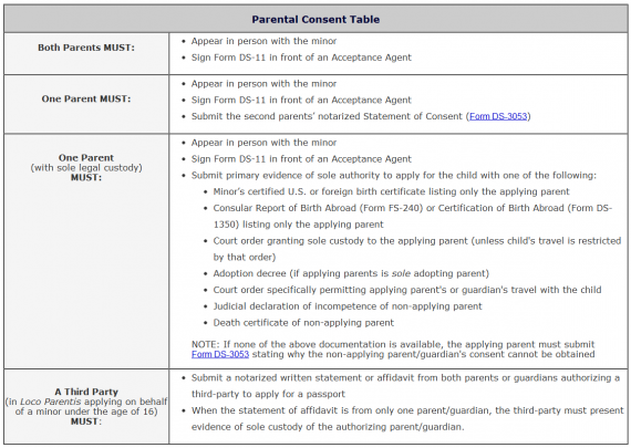 In terms of the passport application, both custodial parents need to be present. If one has sole custody, court documents to that effect are required. If one is deceased and there isn’t an adoptive parent, a death certificate would presumably suffice.