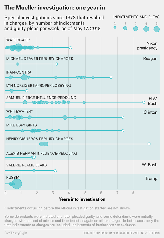 Leaving aside the substance of the Trump and Republican attacks on the Mueller investigation, it’s worth noting, as Amelia Thomson-Deveaux does at FiveThirtyEight, that the Mueller investigation has not been nearly as long as other investigations, many of which were championed by Republicans as conservatives. In her analysis, Thomson-Deveaux catalogs basically every major investigation going back to Watergate and finds, as this chart makes clear, that Mueller’s investigation is but a babe in the woods: (click image to enlarge)