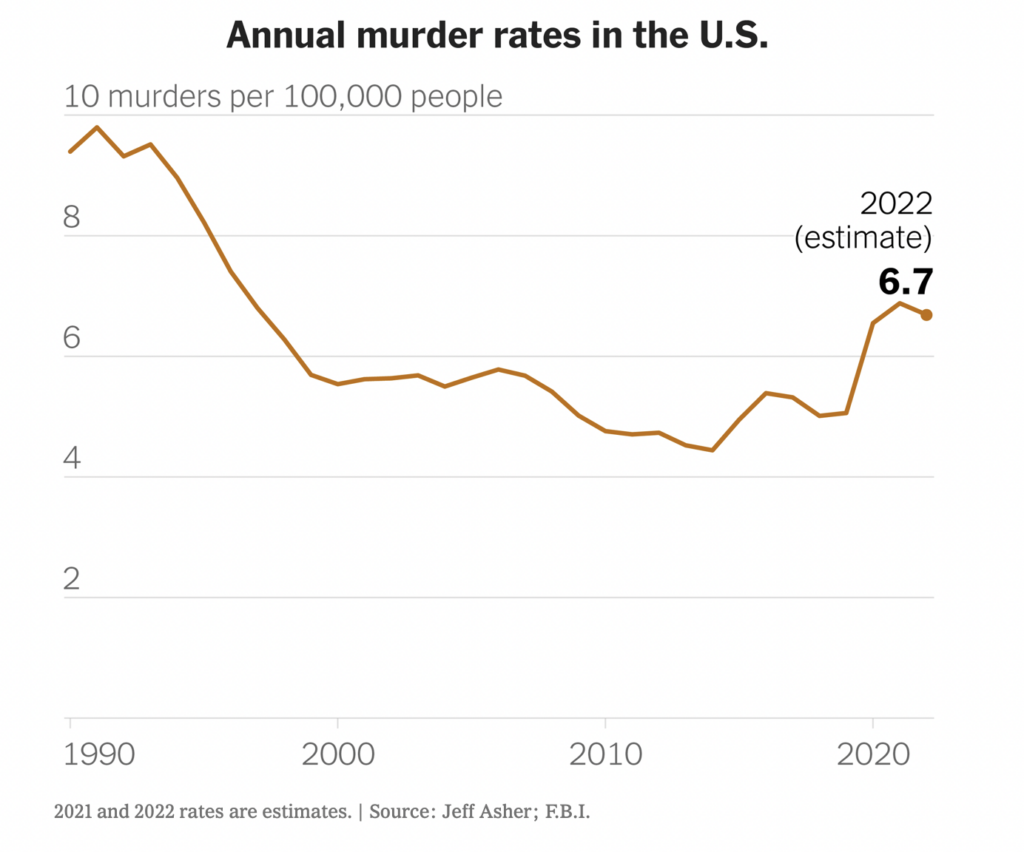 Disruptions related to Covid probably led to more murders and shootings by shutting down social services, which had kept people safe, and closing schools, which left many teens idle. (My colleagues Thomas Fuller and Tim Arango wrote about the connection between the pandemic and gun violence.) But the U.S. has opened back up, which will likely help reverse the effects of the last two years on violent crime.