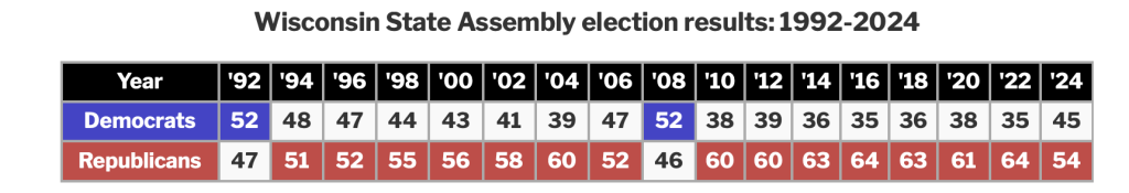In regards to gerrymandering, it seems worth pointing out that Wisconsin is, on the state level, has a partisan split close to 50-50.