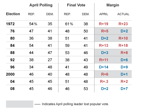 Silver produces this chart of April polling vs. final results for every election going back to 1972: