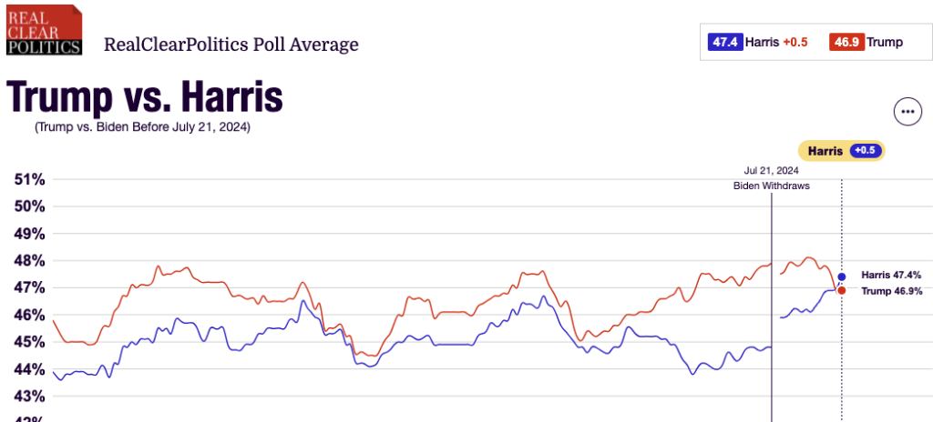 After lagging the obvious polling trends for a few days, RealClearPolitics finally shows Kamala Harris with a slight lead over Donald Trump: