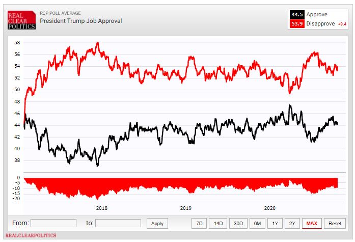 Which, of course, is the whole point of looking at indexes rather than individual polls. An aggregate picture is simply more likely to be accurate than a single poll. And here’s the thing: Trump has literally never been at 50 percent in the RCP average since taking office: