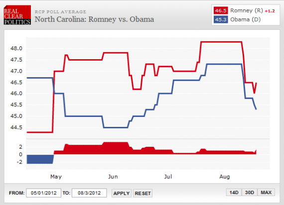 President Obama won North Carolina four years ago by a razor thin margin, and development since then such as the outcome of the 2010 elections in the state and the ongoing problems faced by the state’s Democratic Party have led many to believe that it would be hard for him to repeat there this time around. Recent polling, though, is showing that the Tarheel State is still within the grasp of both candidates: