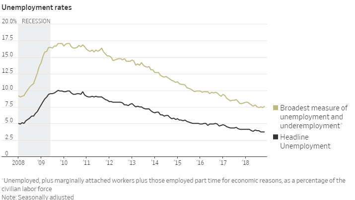 A broader measure of unemployment, including those too discouraged to look for work, plus Americans stuck in part-time jobs but who want to work full-time, rose to 7.6% from 7.4% the prior month. The rate, known as the U-6, has trended this year at the lowest level in 18 years. But it remains slightly above the rate recorded last time the headline unemployment rate stayed near 4%, suggesting there may still be some slack in corners of the labor market.