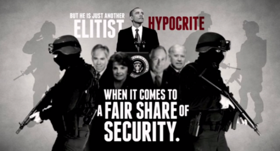 “Mr. Obama demands the wealthy pay their fair share of taxes,” the narrator says. “But he is just another elitist hypocrite when it comes to a fair share of security. Protection for their kids and gun-free zones for ours.”