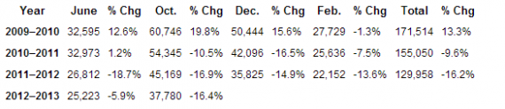 Paul Caron of the University of Cincinnati College of Law reports over at TaxProfBlog that the number of college students taking the Law School Admissions Test has fallen to a 13 year low and the decline shows now signs of stopping. Here are some figures and a chart that tell the tale: