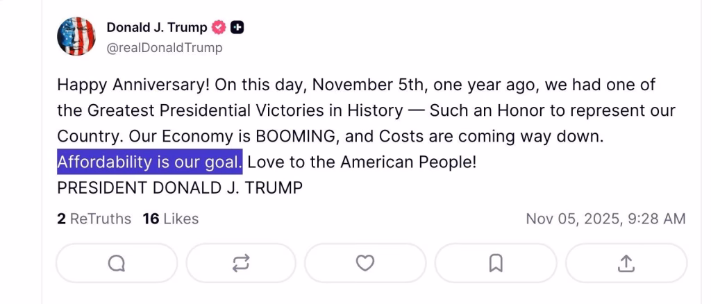 Nope. Instead, Trump is going to claim he is already delivering on Affordability through a BOOMING economy with Costs coming way down despite what your lying eyes are telling you as you shop for groceries and pay your utility bills. It’s going to be extravagant promises “kept” through pure post-fact gaslighting. It remains to be seen if MAGA will actually find out the problem now.