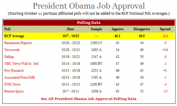 But the problem is that the Newsweek numbers are extreme outliers. Here’s a snapshot of the latest polls as aggregated by RealClearPolitics: