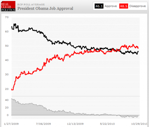 Despite doom-saying about Democrats’ chances in the midterms, the latest NEWSWEEK Poll (full results) shows that they remain in a close race with Republicans 12 days before Election Day, while the president’s approval ratings have climbed sharply. The poll finds that 48 percent of registered voters would be more likely to vote for Democrats, compared with 42 percent who lean Republican (those numbers are similar to those in the last NEWSWEEK Poll, which found Democrats favored 48 percent to 43 percent). President Obama’s approval ratings have jumped substantially, crossing the magic halfway threshold to 54 percent, up from 48 percent in late September, while the portion of respondents who disapprove of the president dropped to 40 percent, the lowest disapproval rating in a NEWSWEEK Poll since February 2010. However, his approval rating, which is notably higher than many recent polls of the president’s popularity, may be evidence of a closing “enthusiasm gap” more than a sea change in voter attitudes, and may not substantially affect Democrats’ fortunes come Election Day. In 1994, NEWSWEEK Polls showed a similar steep climb in President Clinton’s approval between late September and late October, but Democrats still suffered a rout in the midterms.
