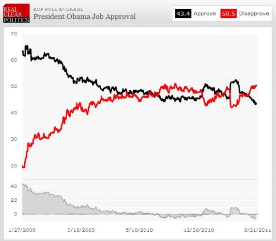 Even if the Gallup number is on the low side, it’s still consistent with the President’s job approval numbers of late, which have been trending negative for most of the past two months: