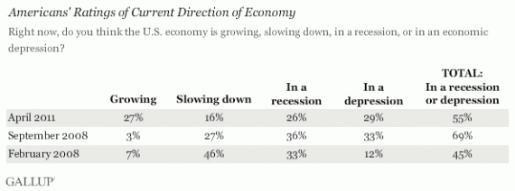 Further evidence of that can be found in a recent (pre bin Laden death) Gallup poll that showed that a majority of Americans believed the economy was still in a recession or depression: